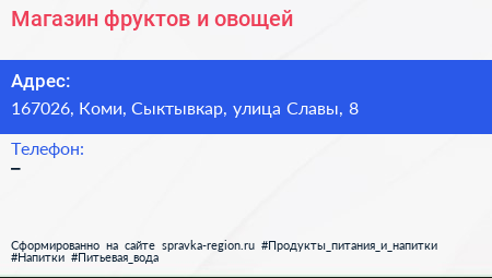 Магазин фруктов и овощей по адресу 167026, Коми, Сыктывкар, улица Славы, 8 в дальнейшем Организация, размещена в следующих категориях: