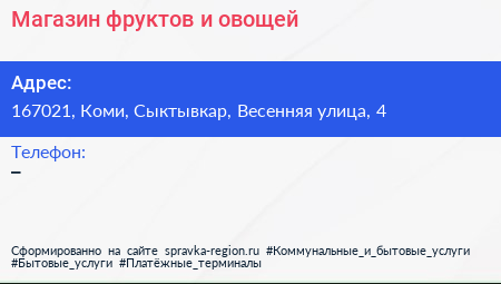Магазин фруктов и овощей по адресу 167021, Коми, Сыктывкар, Весенняя улица, 4 в дальнейшем Организация, размещена в следующих категориях: