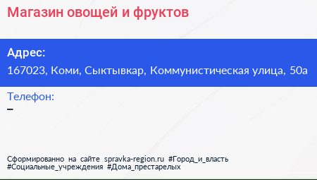 Магазин овощей и фруктов по адресу 167023, Коми, Сыктывкар, Коммунистическая улица, 50а в дальнейшем Организация, размещена в следующих категориях: