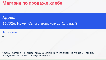 Магазин по продаже хлеба по адресу 167026, Коми, Сыктывкар, улица Славы, 8 в дальнейшем Организация, размещена в следующих категориях: