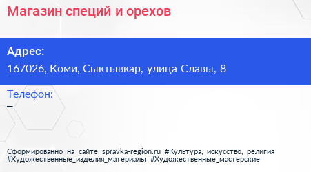 Магазин специй и орехов по адресу 167026, Коми, Сыктывкар, улица Славы, 8 в дальнейшем Организация, размещена в следующих категориях: