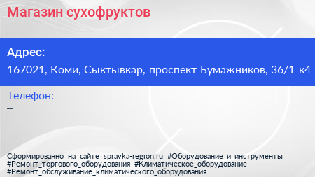 Магазин сухофруктов по адресу 167021, Коми, Сыктывкар, проспект Бумажников, 36/1 к4 в дальнейшем Организация, размещена в следующих категориях: