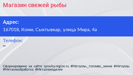Магазин свежей рыбы по адресу 167018, Коми, Сыктывкар, улица Мира, 4а в дальнейшем Организация, размещена в следующих категориях: