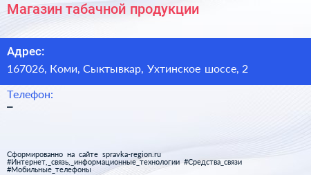 Магазин табачной продукции по адресу 167026, Коми, Сыктывкар, Ухтинское шоссе, 2 в дальнейшем Организация, размещена в следующих категориях: