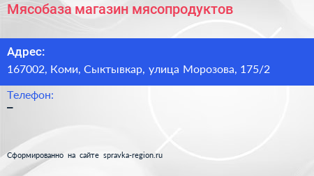 Мясобаза, магазин мясопродуктов по адресу 167002, Коми, Сыктывкар, улица Морозова, 175/2 в дальнейшем Организация, размещена в следующих категориях: