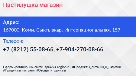 Пастилушка, магазин по адресу 167000, Коми, Сыктывкар, Интернациональная, 157 в дальнейшем Организация, размещена в следующих категориях: