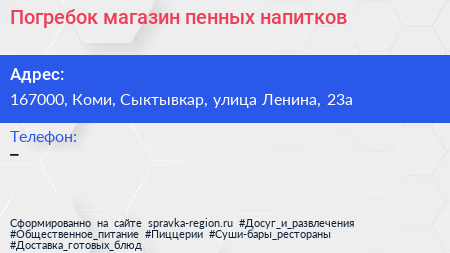 Погребок, магазин пенных напитков по адресу 167000, Коми, Сыктывкар, улица Ленина, 23а в дальнейшем Организация, размещена в следующих категориях: