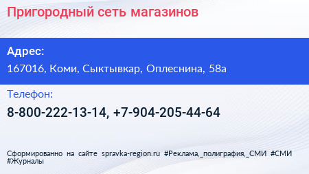 Пригородный, сеть магазинов по адресу 167016, Коми, Сыктывкар, Оплеснина, 58а в дальнейшем Организация, размещена в следующих категориях: