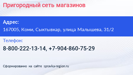 Пригородный, сеть магазинов по адресу 167005, Коми, Сыктывкар, улица Малышева, 31/2 в дальнейшем Организация, размещена в следующих категориях: