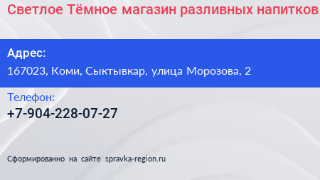 Светлое & Тёмное, магазин разливных напитков по адресу 167023, Коми, Сыктывкар, улица Морозова, 2 в дальнейшем Организация, размещена в следующих категориях: