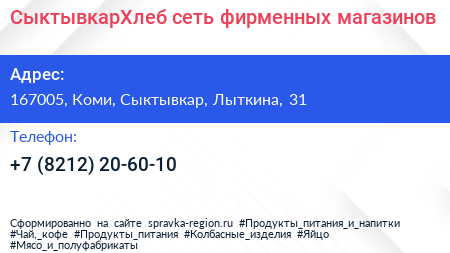 СыктывкарХлеб, сеть фирменных магазинов по адресу 167005, Коми, Сыктывкар, Лыткина, 31 в дальнейшем Организация, размещена в следующих категориях:
