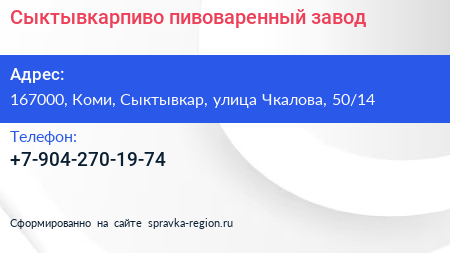 Сыктывкарпиво, пивоваренный завод по адресу 167000, Коми, Сыктывкар, улица Чкалова, 50/14 в дальнейшем Организация, размещена в следующих категориях:
