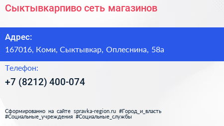 Сыктывкарпиво, сеть магазинов по адресу 167016, Коми, Сыктывкар, Оплеснина, 58а в дальнейшем Организация, размещена в следующих категориях: