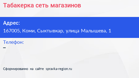 Табакерка, сеть магазинов по адресу 167005, Коми, Сыктывкар, улица Малышева, 1 в дальнейшем Организация, размещена в следующих категориях: