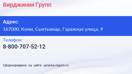 Вирджиния Групп по адресу 167000, Коми, Сыктывкар, Гаражная улица, 9 в дальнейшем Организация, размещена в следующих категориях: