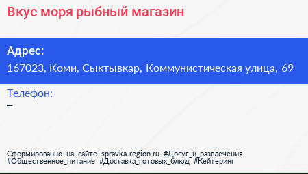 Вкус моря, рыбный магазин по адресу 167023, Коми, Сыктывкар, Коммунистическая улица, 69 в дальнейшем Организация, размещена в следующих категориях:
