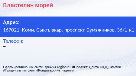 Властелин морей по адресу 167021, Коми, Сыктывкар, проспект Бумажников, 36/1 к1 в дальнейшем Организация, размещена в следующих категориях:
