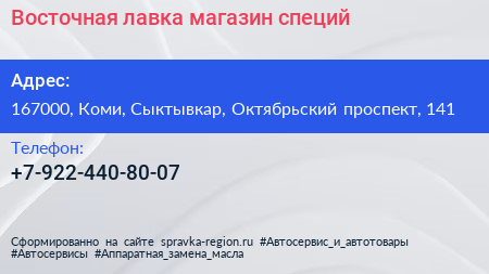 Восточная лавка, магазин специй по адресу 167000, Коми, Сыктывкар, Октябрьский проспект, 141 в дальнейшем Организация, размещена в следующих категориях:
