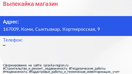 Выпекайка, магазин по адресу 167009, Коми, Сыктывкар, Корткеросская, 9 в дальнейшем Организация, размещена в следующих категориях: