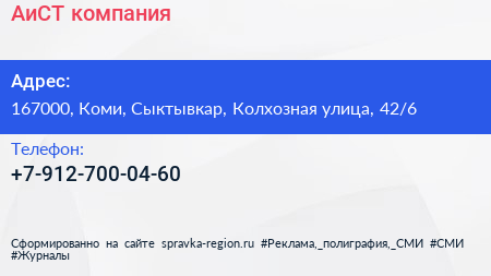 АиСТ, компания по адресу 167000, Коми, Сыктывкар, Колхозная улица, 42/6 в дальнейшем Организация, размещена в следующих категориях: