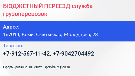 БЮДЖЕТНЫЙ ПЕРЕЕЗД, служба грузоперевозок по адресу 167014, Коми, Сыктывкар, Молодцова, 28 в дальнейшем Организация, размещена в следующих категориях: