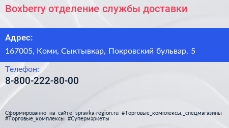 Boxberry, отделение службы доставки по адресу 167005, Коми, Сыктывкар, Покровский бульвар, 5 в дальнейшем Организация, размещена в следующих категориях: