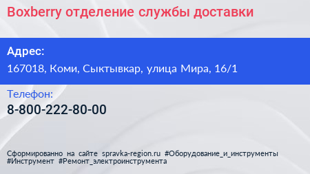 Boxberry, отделение службы доставки по адресу 167018, Коми, Сыктывкар, улица Мира, 16/1 в дальнейшем Организация, размещена в следующих категориях: