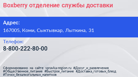 Boxberry, отделение службы доставки по адресу 167005, Коми, Сыктывкар, Лыткина, 31 в дальнейшем Организация, размещена в следующих категориях: