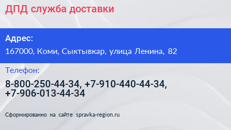 ДПД, служба доставки по адресу 167000, Коми, Сыктывкар, улица Ленина, 82 в дальнейшем Организация, размещена в следующих категориях: