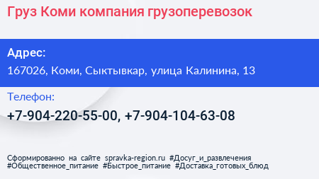 Груз Коми, компания грузоперевозок по адресу 167026, Коми, Сыктывкар, улица Калинина, 13 в дальнейшем Организация, размещена в следующих категориях: