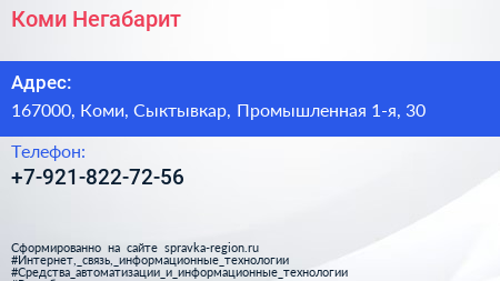 Коми Негабарит по адресу 167000, Коми, Сыктывкар, Промышленная 1-я, 30 в дальнейшем Организация, размещена в следующих категориях: