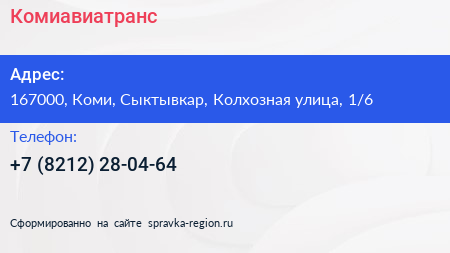 Комиавиатранс по адресу 167000, Коми, Сыктывкар, Колхозная улица, 1/6 в дальнейшем Организация, размещена в следующих категориях: