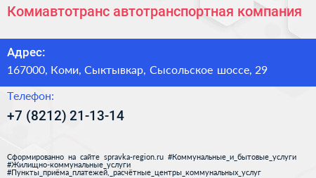 Комиавтотранс, автотранспортная компания по адресу 167000, Коми, Сыктывкар, Сысольское шоссе, 29 в дальнейшем Организация, размещена в следующих категориях: