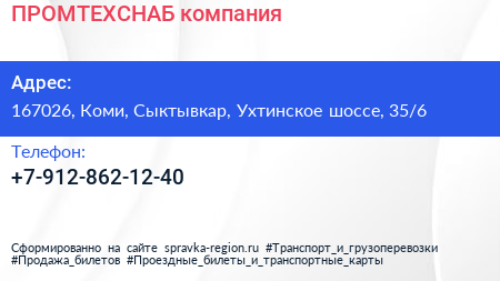 ПРОМТЕХСНАБ, компания по адресу 167026, Коми, Сыктывкар, Ухтинское шоссе, 35/6 в дальнейшем Организация, размещена в следующих категориях: