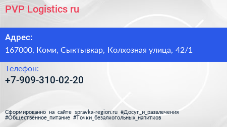 PVP-Logistics.ru по адресу 167000, Коми, Сыктывкар, Колхозная улица, 42/1 в дальнейшем Организация, размещена в следующих категориях: