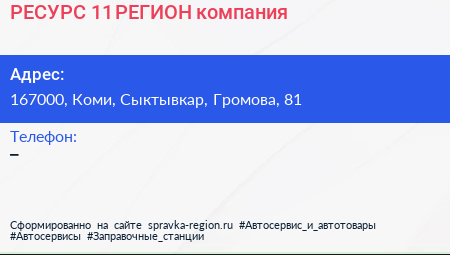 РЕСУРС-11-РЕГИОН, компания по адресу 167000, Коми, Сыктывкар, Громова, 81 в дальнейшем Организация, размещена в следующих категориях: