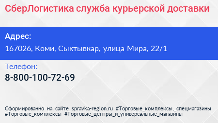 СберЛогистика, служба курьерской доставки по адресу 167026, Коми, Сыктывкар, улица Мира, 22/1 в дальнейшем Организация, размещена в следующих категориях: