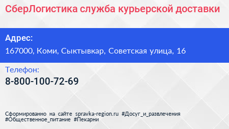 СберЛогистика, служба курьерской доставки по адресу 167000, Коми, Сыктывкар, Советская улица, 16 в дальнейшем Организация, размещена в следующих категориях: