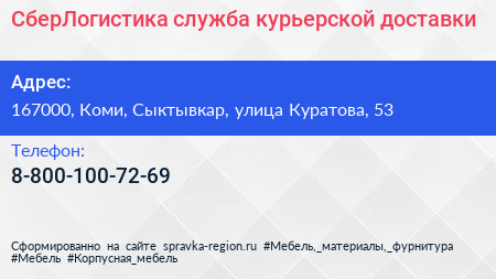 СберЛогистика, служба курьерской доставки по адресу 167000, Коми, Сыктывкар, улица Куратова, 53 в дальнейшем Организация, размещена в следующих категориях:
