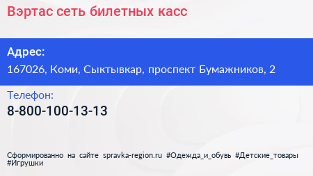 Вэртас, сеть билетных касс по адресу 167026, Коми, Сыктывкар, проспект Бумажников, 2 в дальнейшем Организация, размещена в следующих категориях:
