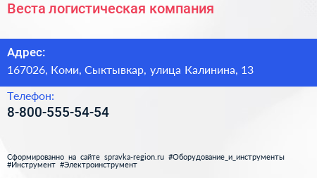 Веста, логистическая компания по адресу 167026, Коми, Сыктывкар, улица Калинина, 13 в дальнейшем Организация, размещена в следующих категориях: