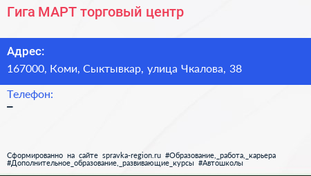 Гига МАРТ, торговый центр по адресу 167000, Коми, Сыктывкар, улица Чкалова, 38 в дальнейшем Организация, размещена в следующих категориях: