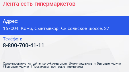 Лента, сеть гипермаркетов по адресу 167004, Коми, Сыктывкар, Сысольское шоссе, 27 в дальнейшем Организация, размещена в следующих категориях: