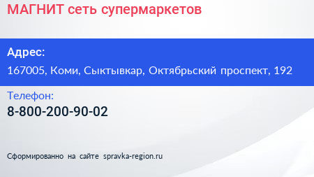МАГНИТ, сеть супермаркетов по адресу 167005, Коми, Сыктывкар, Октябрьский проспект, 192 в дальнейшем Организация, размещена в следующих категориях:
