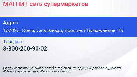 МАГНИТ, сеть супермаркетов по адресу 167026, Коми, Сыктывкар, проспект Бумажников, 45 в дальнейшем Организация, размещена в следующих категориях:
