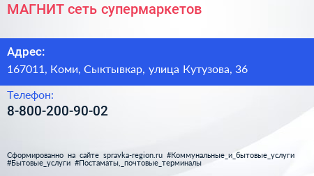 МАГНИТ, сеть супермаркетов по адресу 167011, Коми, Сыктывкар, улица Кутузова, 36 в дальнейшем Организация, размещена в следующих категориях: