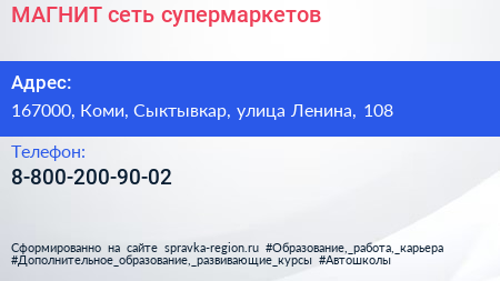 МАГНИТ, сеть супермаркетов по адресу 167000, Коми, Сыктывкар, улица Ленина, 108 в дальнейшем Организация, размещена в следующих категориях: