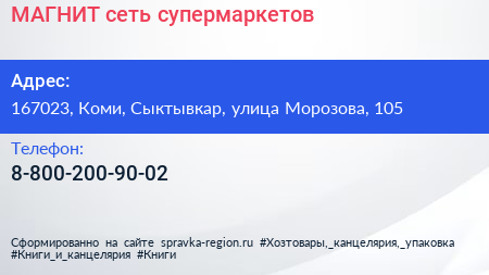 МАГНИТ, сеть супермаркетов по адресу 167023, Коми, Сыктывкар, улица Морозова, 105 в дальнейшем Организация, размещена в следующих категориях: