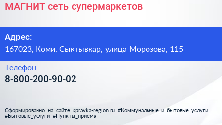 МАГНИТ, сеть супермаркетов по адресу 167023, Коми, Сыктывкар, улица Морозова, 115 в дальнейшем Организация, размещена в следующих категориях: