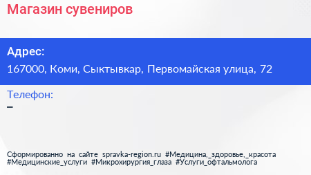 Магазин сувениров по адресу 167000, Коми, Сыктывкар, Первомайская улица, 72 в дальнейшем Организация, размещена в следующих категориях: